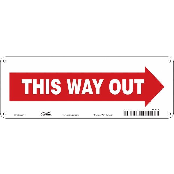 Safety Sign, Vertical Rectangle, Number of Printed Sides 1, English, Sign Legend This Way Out (Arrow), Sign Legend Background Color White, Sign Legend Style Symbol and Text