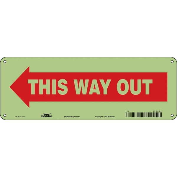 Safety Sign, Vertical Rectangle, Number of Printed Sides 1, English, Sign Legend This Way Out (Arrow), Sign Legend Background Color White, Sign Legend Style Symbol and Text