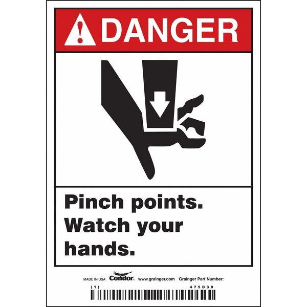 Safety Sign, Vertical Rectangle, Number of Printed Sides 1, English, Sign Format ANSI/OSHA Format, Sign Legend Pinch Points. Watch Your Hands., Sign Legend Background Color White, Sign Legend Style Symbol and Text