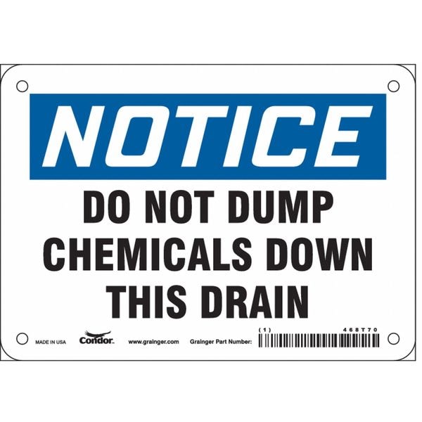 Safety Sign, Horizontal Rectangle, Number of Printed Sides 1, English, Sign Format Traditional OSHA, Sign Legend Do Not Dump Chemicals Down This Drain, Sign Legend Background Color White, Sign Legend Style Text