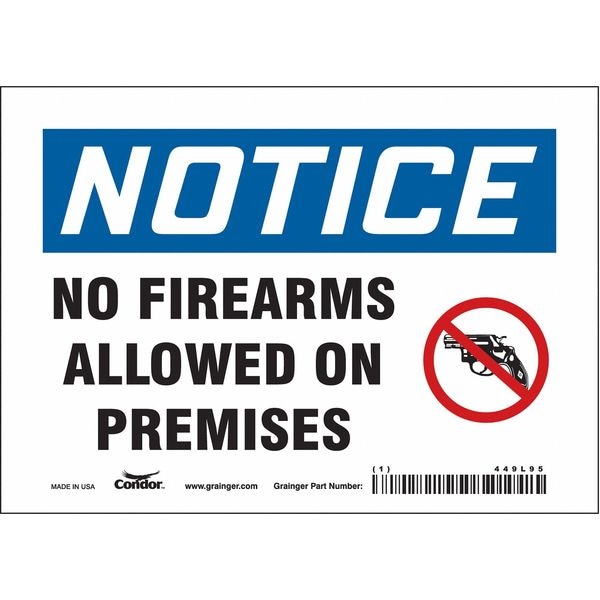 Safety Sign, Horizontal Rectangle, Number of Printed Sides 1, English, Sign Legend No Firearms Allowed On Premises, Sign Legend Background Color White, Sign Legend Style Symbol and Text