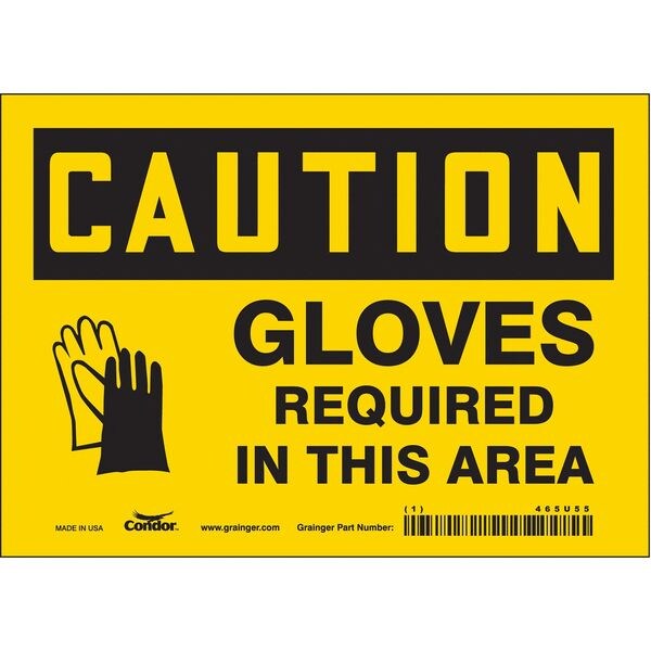 Safety Sign, Horizontal Rectangle, Number of Printed Sides 1, English, Sign Format Traditional OSHA, Sign Legend Gloves Required In This Area, Sign Legend Background Color Yellow, Sign Legend Style Symbol and Text