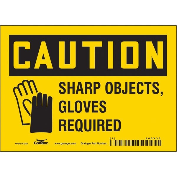 Safety Sign, Horizontal Rectangle, Number of Printed Sides 1, English, Sign Format Traditional OSHA, Sign Legend Sharp Objects, Gloves Required, Sign Legend Background Color Yellow, Sign Legend Style Text
