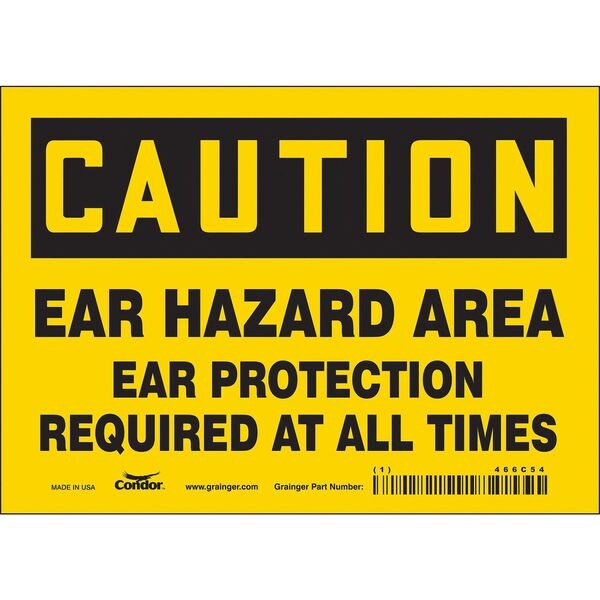 Safety Sign, Horizontal Rectangle, Number of Printed Sides 1, English, Sign Format Traditional OSHA, Sign Legend Ear Hazard Area Ear Protection Required At All Times, Sign Legend Background Color Yellow, Sign Legend Style Text