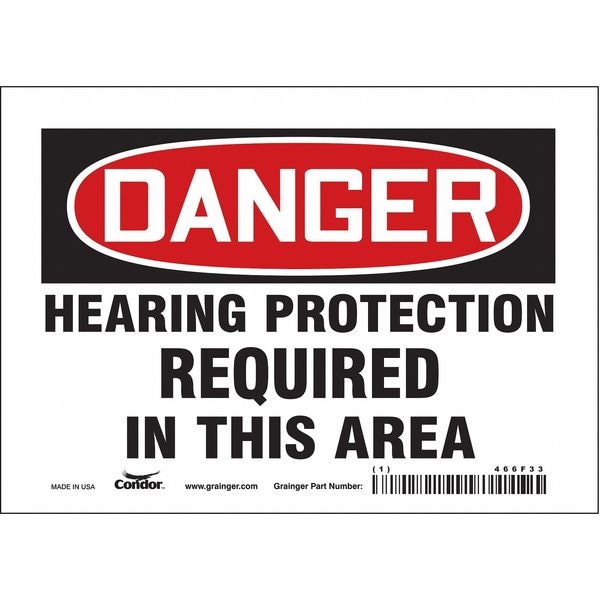 Safety Sign, Horizontal Rectangle, Number of Printed Sides 1, English, Sign Format Traditional OSHA, Sign Legend Hearing Protection Required In This Area, Sign Legend Background Color White, Sign Legend Style Text