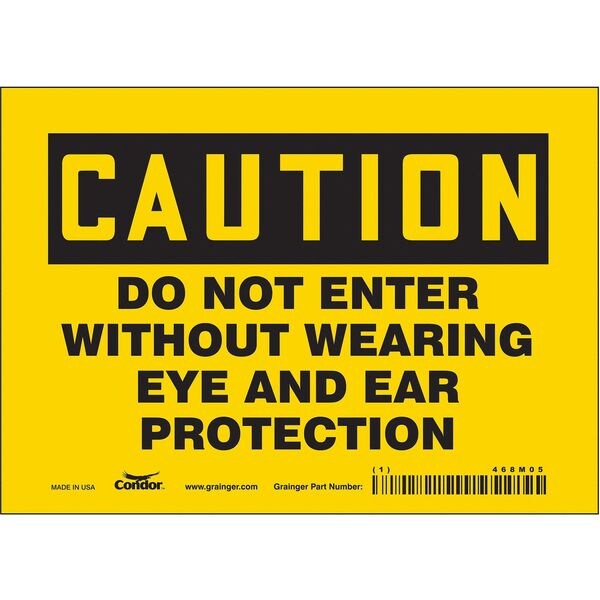 Safety Sign, Horizontal Rectangle, Number of Printed Sides 1, English, Sign Format Traditional OSHA, Sign Legend Do Not Enter Without Wearing Eye And Ear Protection, Sign Legend Background Color Yellow, Sign Legend Style Text