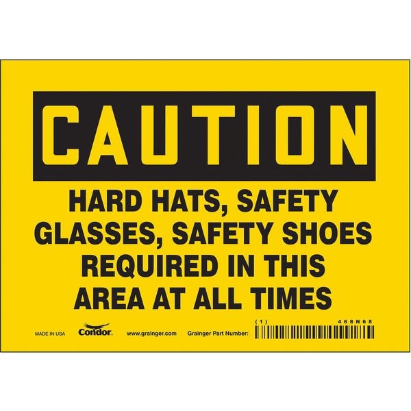 Safety Sign, Horizontal Rectangle, Number of Printed Sides 1, English, Sign Format Traditional OSHA, Sign Legend Hard Hats, Safety Glasses, Safety Shoes Required In This Area At All Times, Sign Legend Background Color Yellow, Sign Legend Style Text