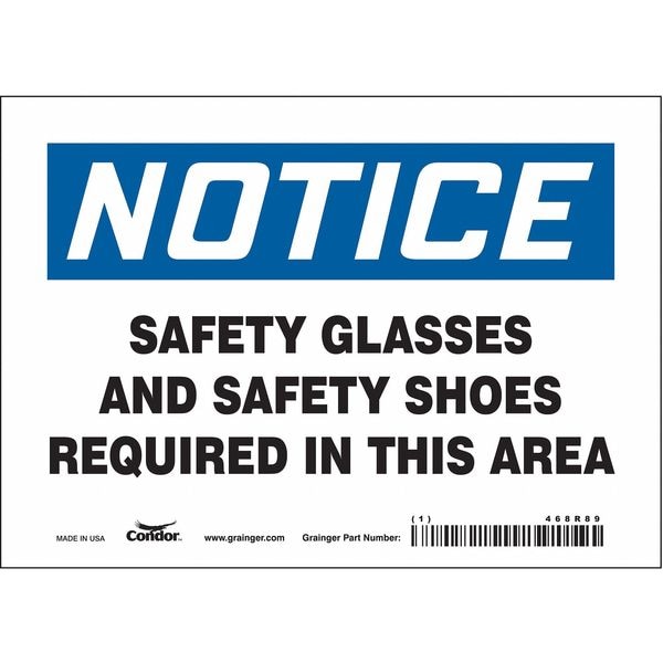 Safety Sign, Horizontal Rectangle, Number of Printed Sides 1, English, Sign Format Traditional OSHA, Sign Legend Safety Glasses And Safety Shoes Requried In This Area, Sign Legend Background Color White, Sign Legend Style Text