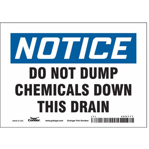 Safety Sign, Horizontal Rectangle, Number of Printed Sides 1, English, Sign Format Traditional OSHA, Sign Legend Do Not Dump Chemicals Down This Drain, Sign Legend Background Color White, Sign Legend Style Text