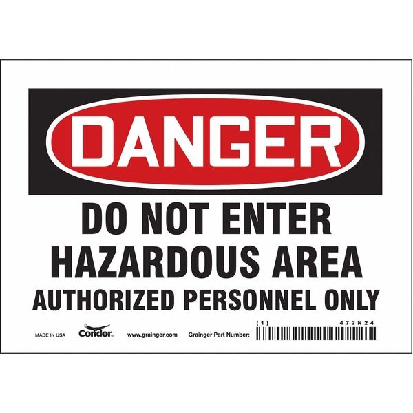 Safety Sign, Horizontal Rectangle, Number of Printed Sides 1, English, Sign Format Traditional OSHA, Sign Legend Do Not Enter Hazardous Area Authorized Persons Only, Sign Legend Background Color White, Sign Legend Style Text