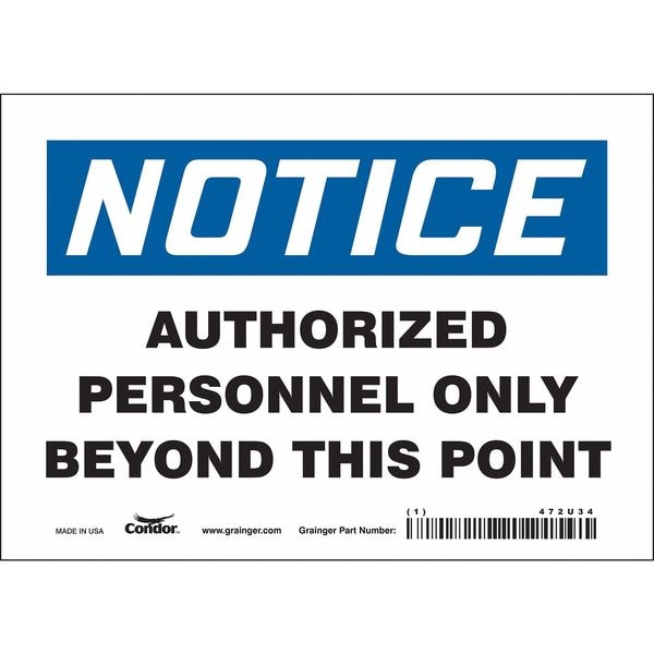 Safety Sign, Horizontal Rectangle, Number of Printed Sides 1, English, Sign Format Traditional OSHA, Sign Legend Authorized Personnel Only Beyond This Point, Sign Legend Background Color White, Sign Legend Style Text