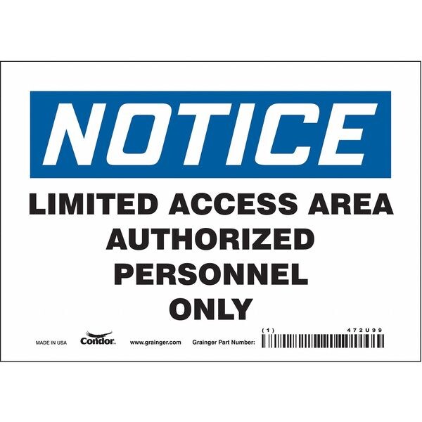 Safety Sign, Horizontal Rectangle, Number of Printed Sides 1, English, Sign Format Traditional OSHA, Sign Legend Limited Access Area Authorized Personnel Only, Sign Legend Background Color White, Sign Legend Style Text