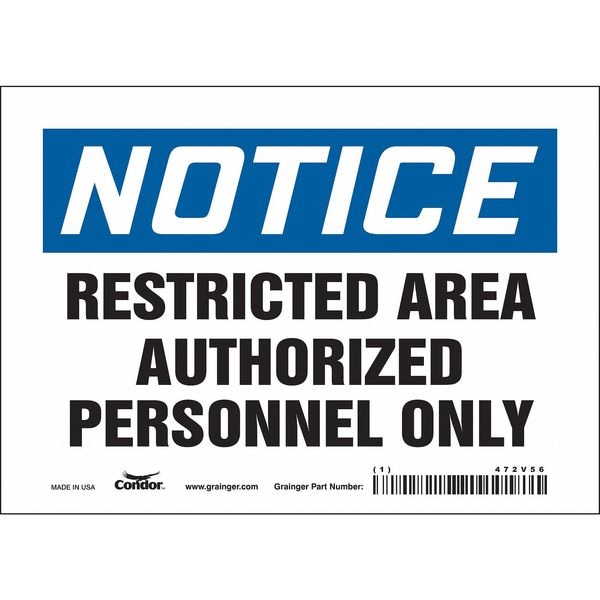 Safety Sign, Horizontal Rectangle, Number of Printed Sides 1, English, Sign Format Traditional OSHA, Sign Legend Restricted Area Authorized Personnel Only, Sign Legend Background Color White, Sign Legend Style Text
