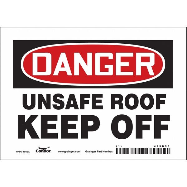 Safety Sign, Horizontal Rectangle, Number of Printed Sides 1, English, Sign Format Traditional OSHA, Sign Legend Unsafe Roof Keep Off, Sign Legend Background Color White, Sign Legend Style Text