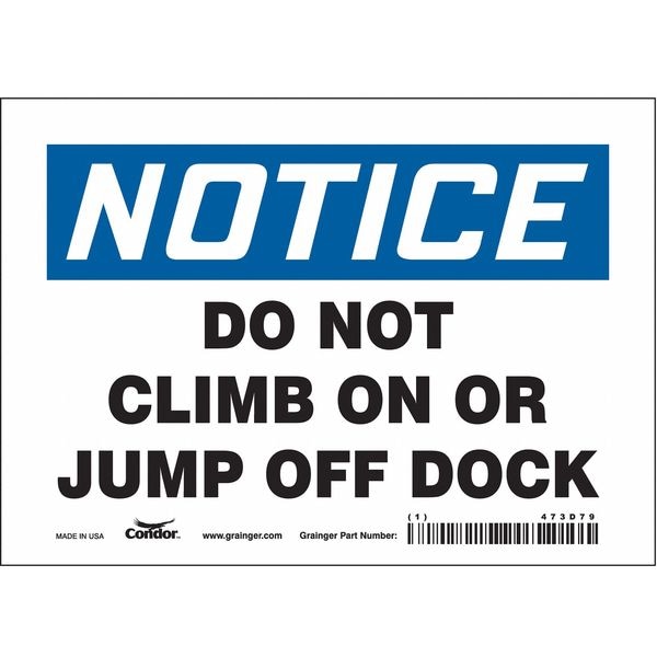 Safety Sign, Horizontal Rectangle, Number of Printed Sides 1, English, Sign Format Traditional OSHA, Sign Legend Do Not Climb On Or Jump Off Dock, Sign Legend Background Color White, Sign Legend Style Text