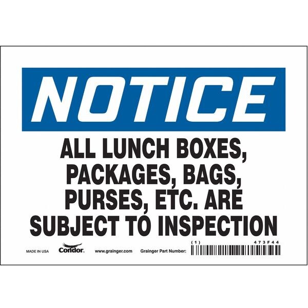 Safety Sign, Horizontal Rectangle, Number of Printed Sides 1, English, Sign Format Traditional OSHA, Sign Legend All Lunch Boxes, Packages, Bags, Purses, Etc. Are Subject To Inspection, Sign Legend Background Color White, Sign Legend Style Text