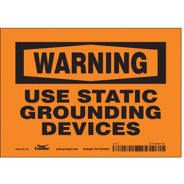 Safety Sign, Horizontal Rectangle, Number of Printed Sides 1, English, Sign Format Traditional OSHA, Sign Legend Use Static Grounding Devices, Sign Legend Background Color Orange, Sign Legend Style Text