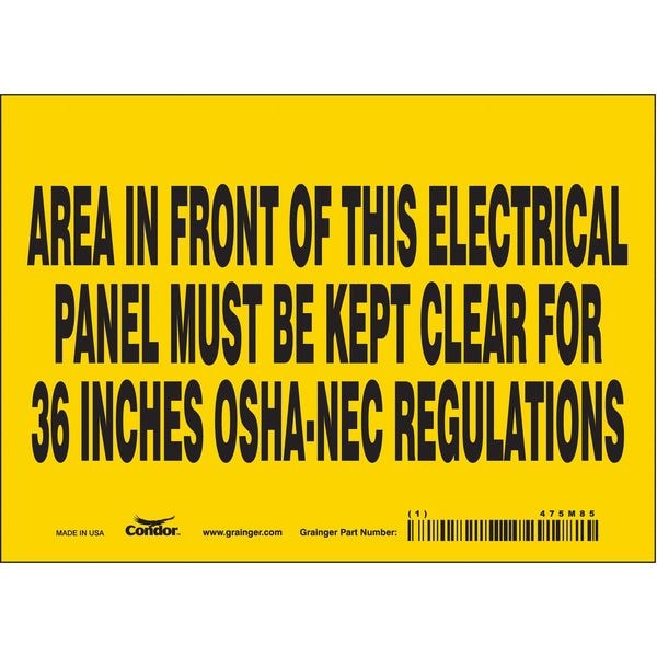Safety Sign, Horizontal Rectangle, Number of Printed Sides 1, English, Sign Format Other Format, Sign Legend Area In Front Of This Electrical Panel Must Be Kept Clear For 36 In Osha-Nec Regulations, Sign Legend Background Color Yellow, Sign Legend Style Text