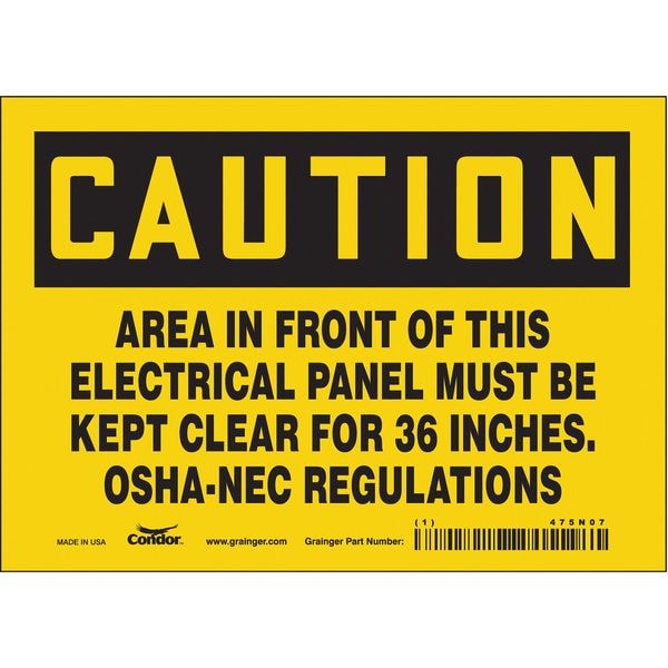 Safety Sign, Horizontal Rectangle, Number of Printed Sides 1, English, Sign Format Traditional OSHA, Sign Legend Area In Front Of This Electrical Panel Must Be Kept Clear For 36 Inches Osha-Nec Regulations, Sign Legend Background Color Yellow, Sign Legend Style Text