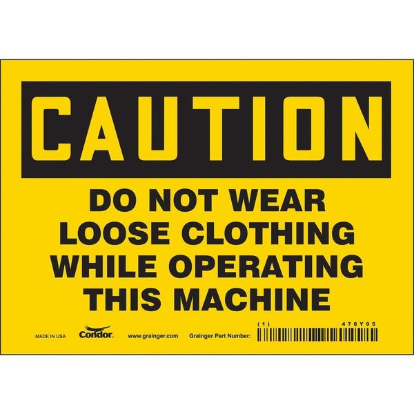 Safety Sign, Horizontal Rectangle, Number of Printed Sides 1, English, Sign Format Traditional OSHA, Sign Legend Do Not Wear Loose Clothing While Operating This Machine, Sign Legend Background Color Yellow, Sign Legend Style Text
