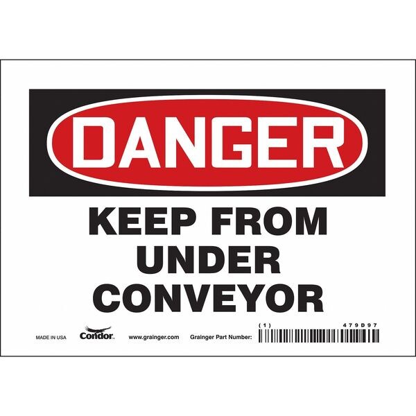 Safety Sign, Horizontal Rectangle, Number of Printed Sides 1, English, Sign Format Traditional OSHA, Sign Legend Keep From Under Conveyor, Sign Legend Background Color White, Sign Legend Style Text
