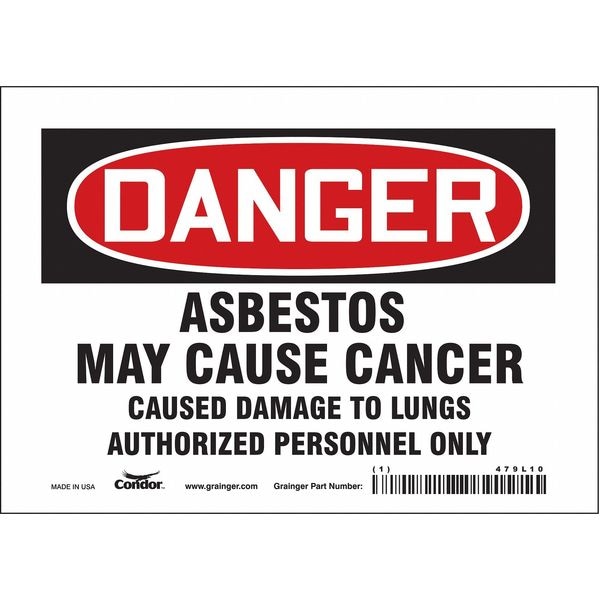 Safety Sign, Horizontal Rectangle, Number of Printed Sides 1, English, Sign Format Traditional OSHA, Sign Legend Asbestos May Cause Cancer Causes Damage To Lungs Authorized Personnel Only, Sign Legend Background Color White, Sign Legend Style Text