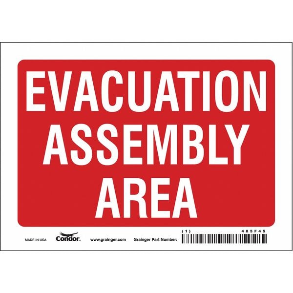 Safety Sign, Horizontal Rectangle, Number of Printed Sides 1, English, Sign Legend Evacuation Assembly Area, Sign Legend Background Color Red, Sign Legend Style Text