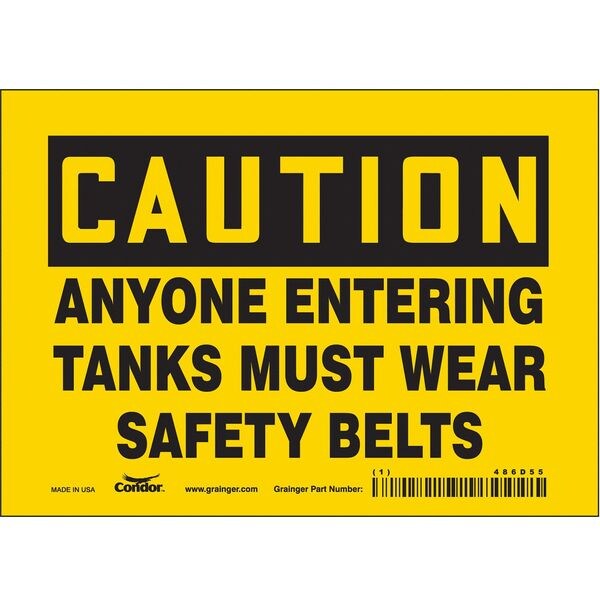 Safety Sign, Horizontal Rectangle, Number of Printed Sides 1, English, Sign Format Traditional OSHA, Sign Legend Anyone Entering Tanks Must Wear Safety Belts, Sign Legend Background Color Yellow, Sign Legend Style Text