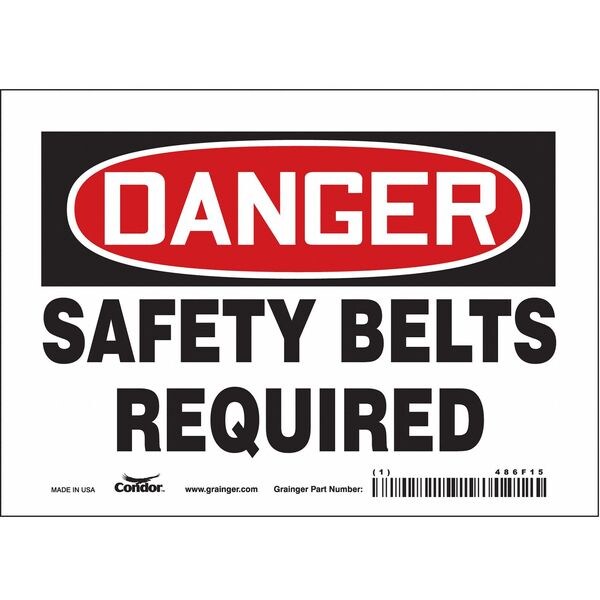 Safety Sign, Horizontal Rectangle, Number of Printed Sides 1, English, Sign Format Traditional OSHA, Sign Legend Safety Belts Required, Sign Legend Background Color White, Sign Legend Style Text