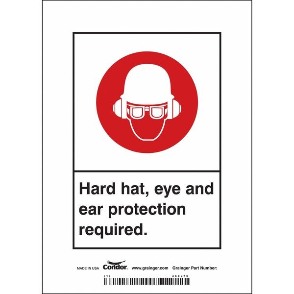 Safety Sign, Vertical Rectangle, Number of Printed Sides 1, English, Sign Format Other Format, Sign Legend Hard Hat, Eye And Ear Protection Required., Sign Legend Background Color White, Sign Legend Style Symbol and Text