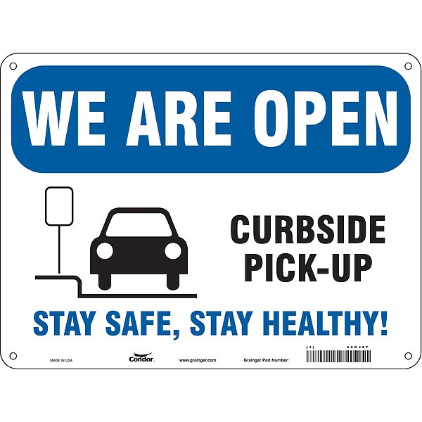 Safety Sign, Height 18 in, Width 24 in, Sign Material Plastic, Header We Are Open, Legend Curbside Pick-Up Stay Safe, Stay Healthy!, Printed Language English