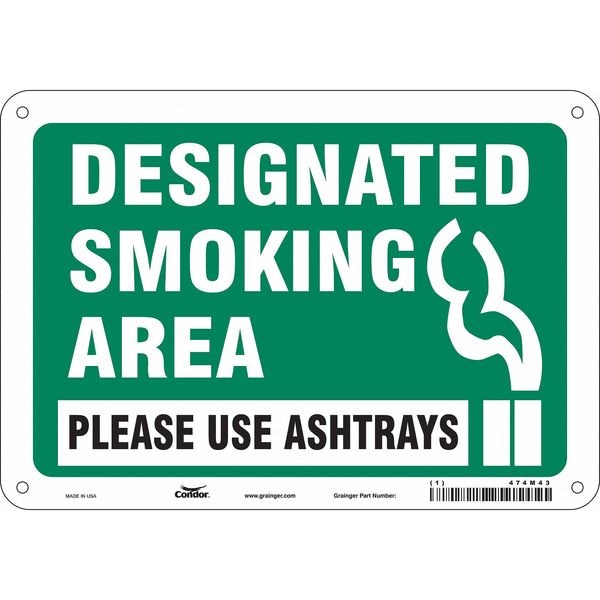 Safety Sign, Vertical Rectangle, Number of Printed Sides 1, English, Sign Format Other Format, Sign Legend Designated Smoking Area Please Use Ashtrays, Sign Legend Background Color Green, White, Sign Legend Style Symbol and Text