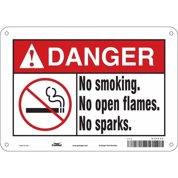 Safety Sign, Vertical Rectangle, Number of Printed Sides 1, English, Sign Format ANSI/OSHA Format, Sign Legend No Smoking, No Open Flames, No Sparks., Sign Legend Background Color White, Sign Legend Style Symbol and Text