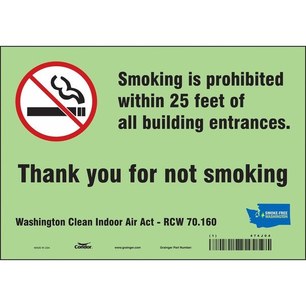 Safety Sign, Vertical Rectangle, Number of Printed Sides 1, English, Sign Format Other Format, Sign Legend Smoking Is Prohibited Within 25 Feet Of All Building Entrances. Thank You For Not Smoking - Washington Clean Indoor Air Act - Rcw 70.160, Sign Legend Background Color Green, Sign Legend Style Symbol and Text