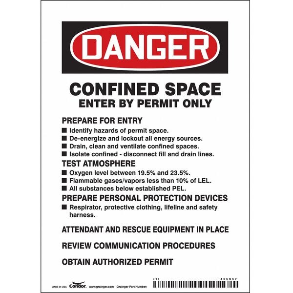 Safety Sign, Vertical Rectangle, Number of Printed Sides 1, English, Sign Format Traditional OSHA, Sign Legend Confined Space Enter By Permit Only Prepare For Entry Test Atmosphere Prepare Personal Protection Devices Attendant And Rescue Equipment In Place Review Communication Procedures Obtain Authorized Permit, Sign Legend Background Color White, Sign Legend Style Text