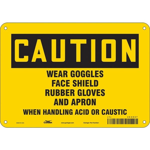 Safety Sign, Vertical Rectangle, Number of Printed Sides 1, English, Sign Format Traditional OSHA, Sign Legend Wear Goggles Face Shield Rubber Gloves And Apron When Handling Acid Or Caustic, Sign Legend Background Color Yellow, Sign Legend Style Text