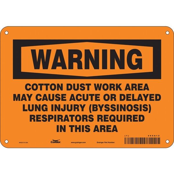 Safety Sign, Vertical Rectangle, Number of Printed Sides 1, English, Sign Format Traditional OSHA, Sign Legend Cotton Dust Work Area May Cause Acute Or Delayed Lung Injury (Byssnosis) Respirators Required In This Area, Sign Legend Background Color Orange, Sign Legend Style Text