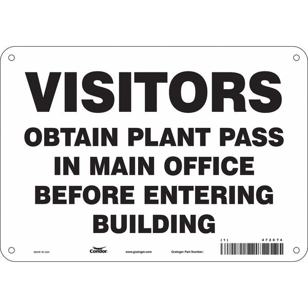 Safety Sign, Vertical Rectangle, Number of Printed Sides 1, English, Sign Format Other Format, Sign Legend Visitors Obtain Plant Pass In Main Office Before Entering Building, Sign Legend Background Color White, Sign Legend Style Text
