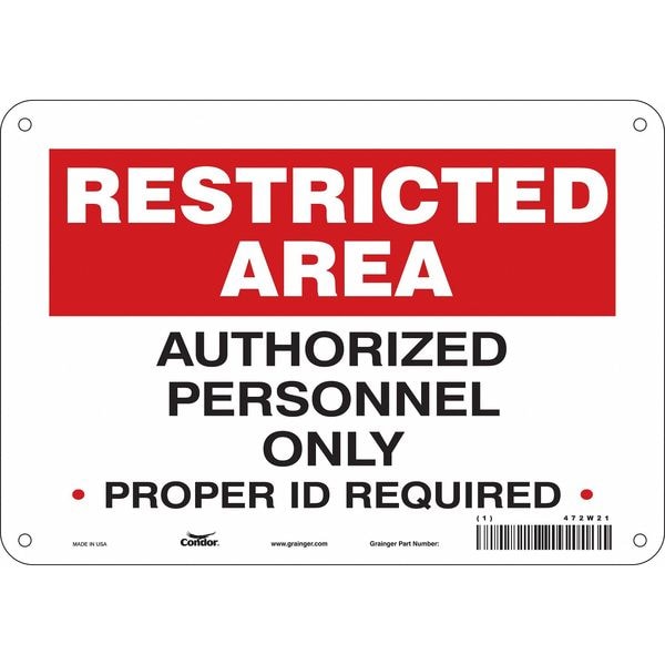 Safety Sign, Vertical Rectangle, Number of Printed Sides 1, English, Sign Format Other Format, Sign Legend Authorized Personnel Only Proper ID Required, Sign Legend Background Color Red, White, Sign Legend Style Text