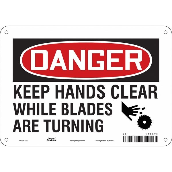 Safety Sign, Vertical Rectangle, Number of Printed Sides 1, English, Sign Format Traditional OSHA, Sign Legend Keep Hands Clear While Blades Are Turning, Sign Legend Background Color White, Sign Legend Style Symbol and Text
