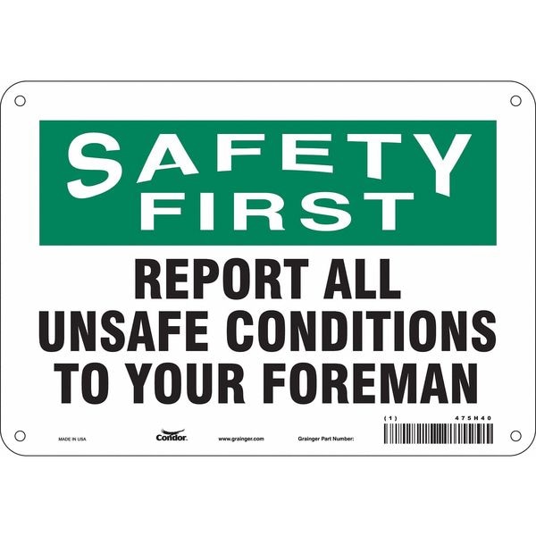 Safety Sign, Vertical Rectangle, Number of Printed Sides 1, English, Sign Format Traditional OSHA, Sign Legend Report All Unsafe Conditions To Your Foreman, Sign Legend Background Color White, Sign Legend Style Text
