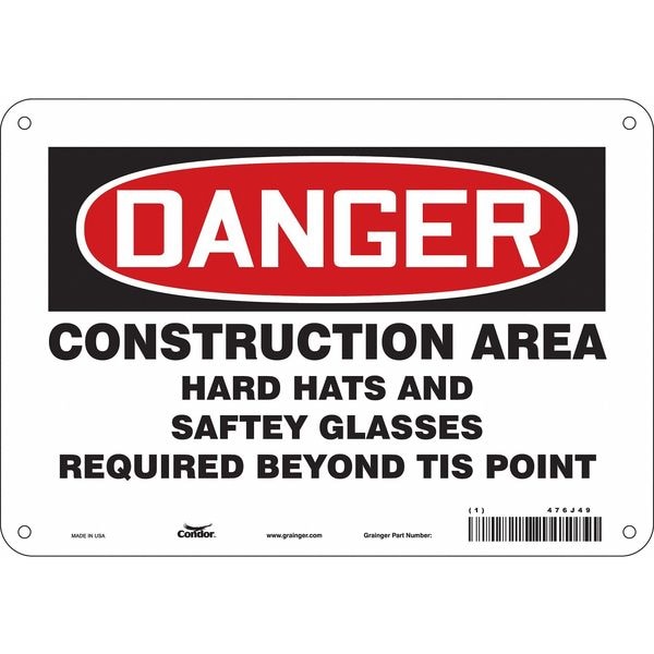 Safety Sign, Vertical Rectangle, Number of Printed Sides 1, English, Sign Format Traditional OSHA, Sign Legend Construction Area Hard Hats And Safety Glasses Required Beyond This Point, Sign Legend Background Color White, Sign Legend Style Text