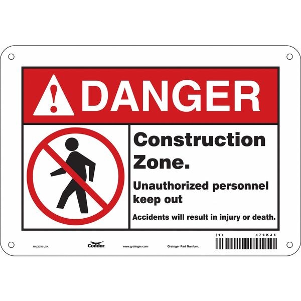 Safety Sign, Vertical Rectangle, Number of Printed Sides 1, English, Sign Format ANSI/OSHA Format, Sign Legend Construction Zone. Unauthorized Personnel Keep Out. Accident Will Result In Injury Or Death., Sign Legend Background Color White, Sign Legend Style Symbol and Text