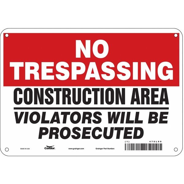 Safety Sign, Vertical Rectangle, Number of Printed Sides 1, English, Sign Format Traditional OSHA, Sign Legend Construction Area Violators Will Be Prosecuted, Sign Legend Background Color Red, White, Sign Legend Style Text