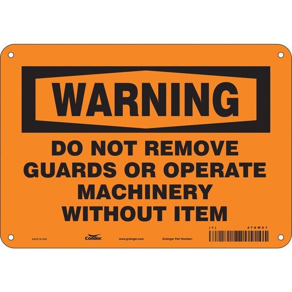 Safety Sign, Vertical Rectangle, Number of Printed Sides 1, English, Sign Format Traditional OSHA, Sign Legend Do Not Remove Guards Or Operate Machinery Without, Sign Legend Background Color Orange, Sign Legend Style Text