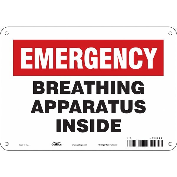 Safety Sign, Vertical Rectangle, Number of Printed Sides 1, English, Sign Legend Breathing Apparatus Inside, Sign Legend Background Color Red, White, Sign Legend Style Text