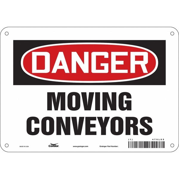Safety Sign, Vertical Rectangle, Number of Printed Sides 1, English, Sign Format Traditional OSHA, Sign Legend Moving Conveyors, Sign Legend Background Color White, Sign Legend Style Text