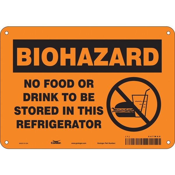 Safety Sign, Vertical Rectangle, Number of Printed Sides 1, English, Sign Format Other Format, Sign Legend Biohazard No Food Or Drink To Be Stored In This Refrigerator, Sign Legend Background Color Black, Orange, Sign Legend Style Symbol and Text