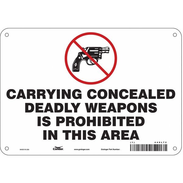 Safety Sign, Vertical Rectangle, Number of Printed Sides 1, English, Sign Legend Carrying Concealed Deadly Weapons Is Prohibited In This Area, Sign Legend Background Color White, Sign Legend Style Symbol and Text