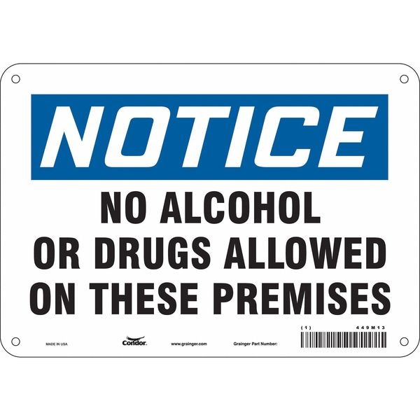 Safety Sign, Vertical Rectangle, Number of Printed Sides 1, English, Sign Format Traditional OSHA, Sign Legend No Alcohol Or Drugs Allowed On These Premises, Sign Legend Background Color White, Sign Legend Style Text